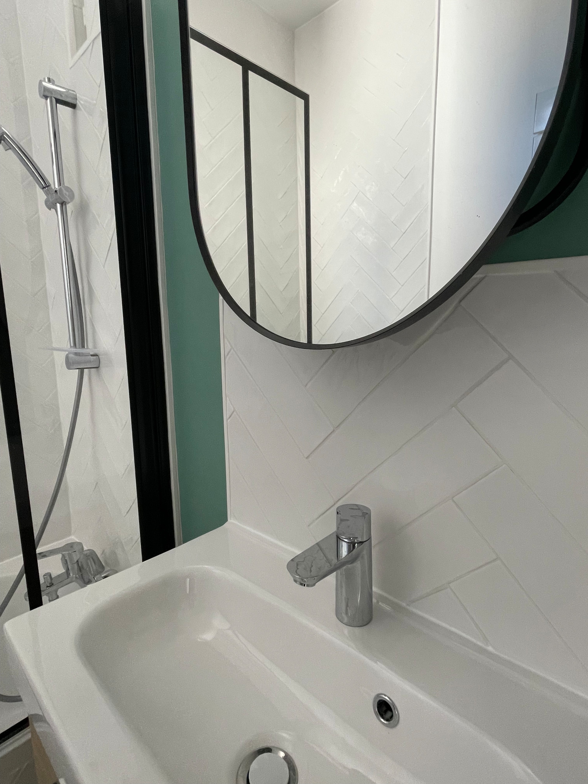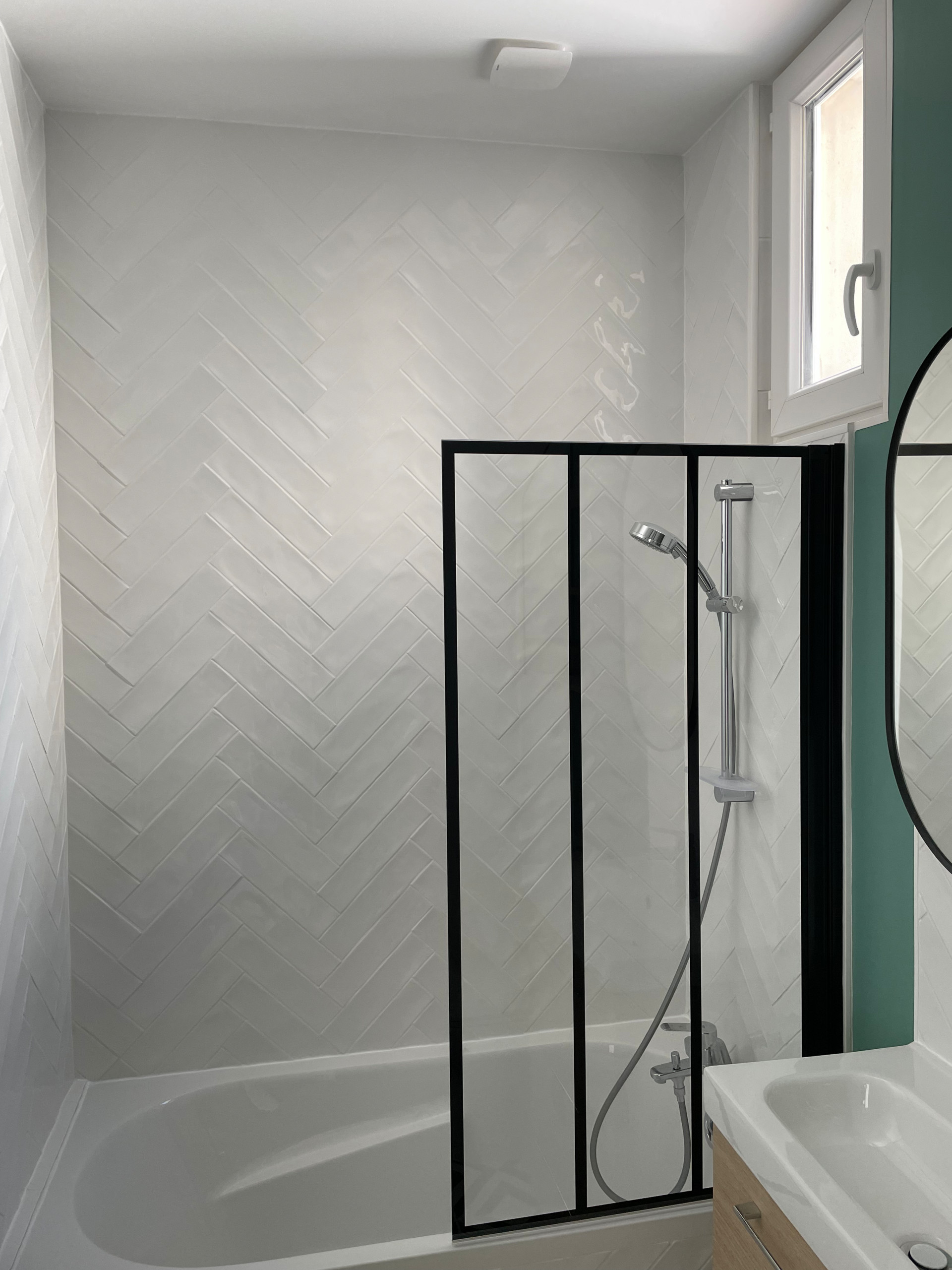 J'ai commencé par rénover entièrement la salle de bain, en choisissant un carrelage blanc pour maximiser la luminosité et créer une ambiance élégante et contemporaine. Pour ajouter une touche d'originalité, j'ai opté pour un carrelage graphique qui apporte du dynamisme à l'espace.